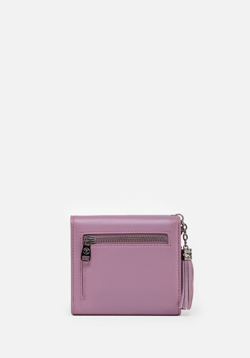 Esta pieza de fino cuero y silueta clásica. estilo sobre. posee un encanto particular. La magia se desprende de su pompón de cuero y del corazón metálico. este último con el logo de la marca. Detalles que le dan un giro a esta billetera. que cuenta con una estructura de dos cuerpos con compartimientos para billetes. tarjeteros y un sencillero exterior. Un verdadero encanto funcional.