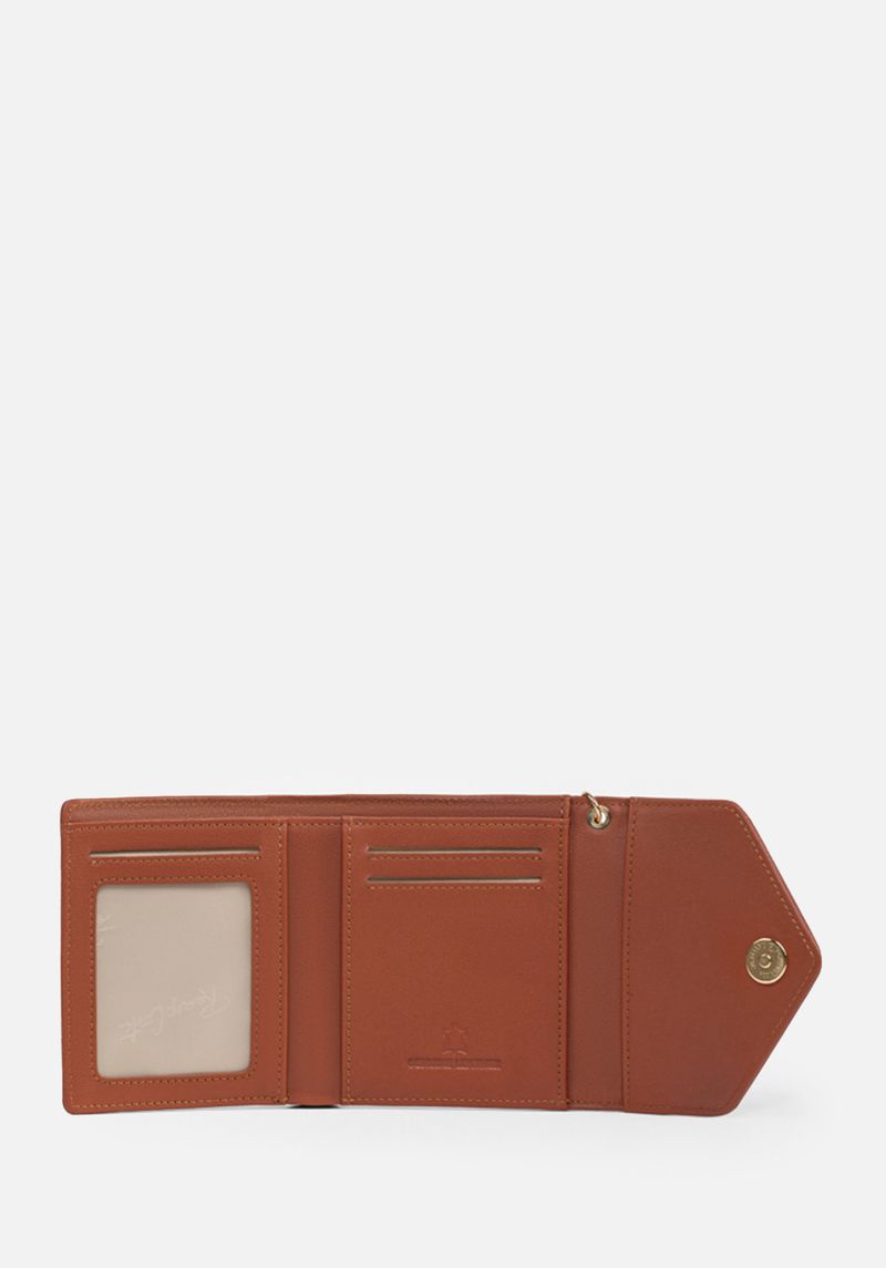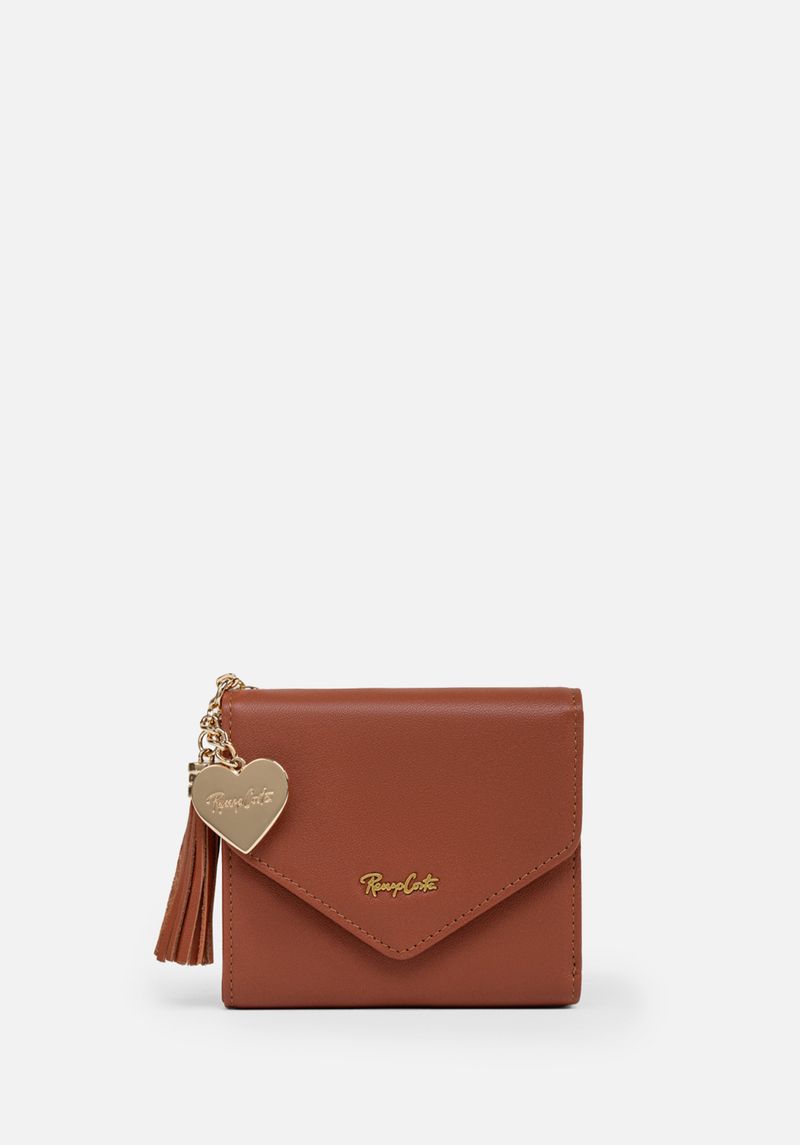 Esta pieza de fino cuero y silueta clásica. estilo sobre. posee un encanto particular. La magia se desprende de su pompón de cuero y del corazón metálico. este último con el logo de la marca. Detalles que le dan un giro a esta billetera. que cuenta con una estructura de dos cuerpos con compartimientos para billetes. tarjeteros y un sencillero exterior. Un verdadero encanto funcional.