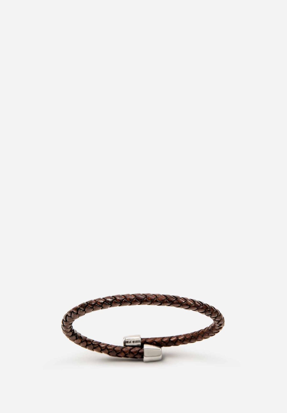 La Pulsera Dual Twist, elaborada en cuero liso trenzado, es un accesorio unisex con diseño abierto y terminales metálicos de acabado brillante. Su forma flexible permite un calce cómodo, ideal para usar solo o combinado con otras pulseras. Una pieza de estilo minimalista que destaca por su textura sobria y su versatilidad para acompañar looks urbanos, casuales o de inspiración contemporánea.