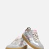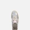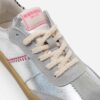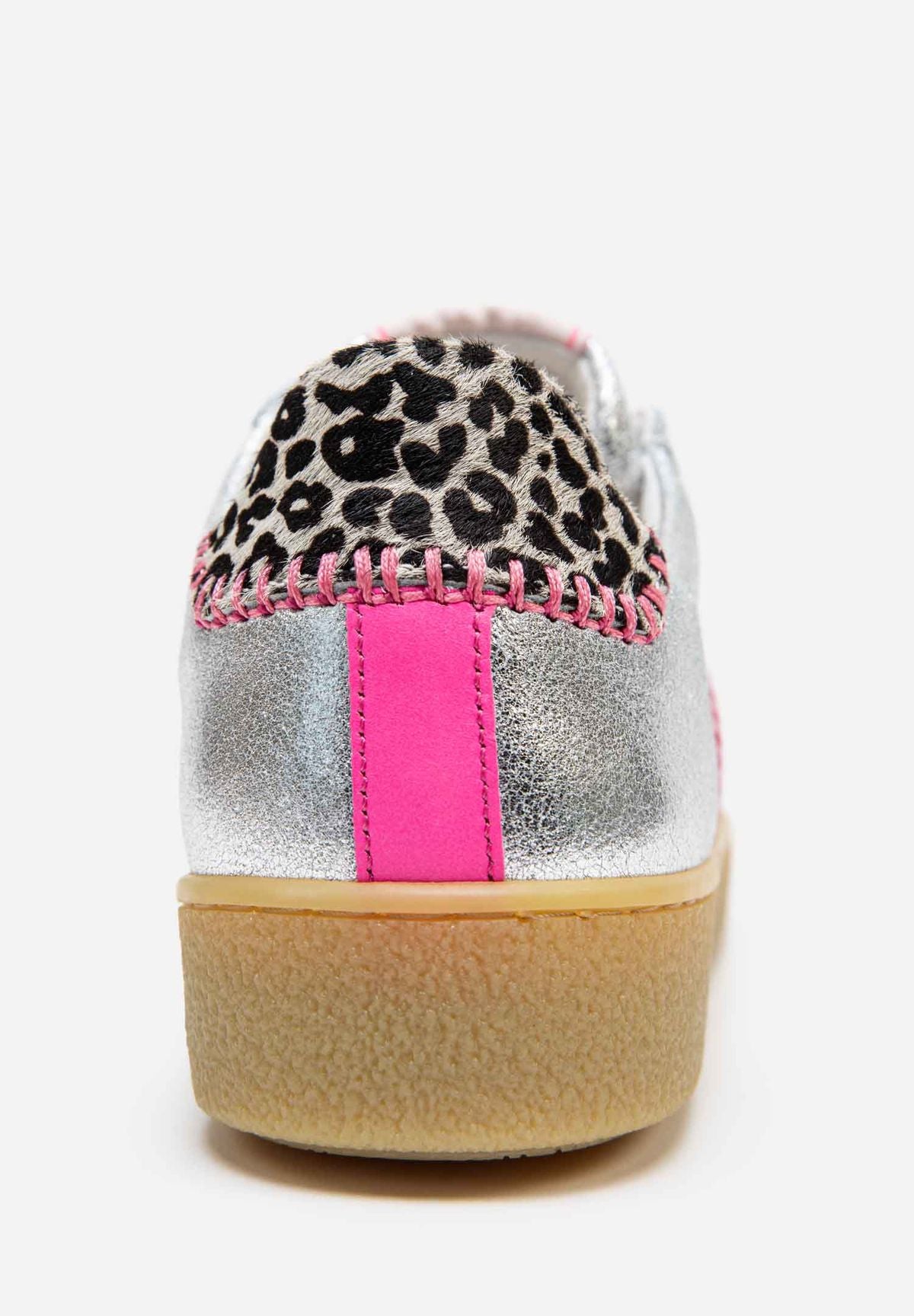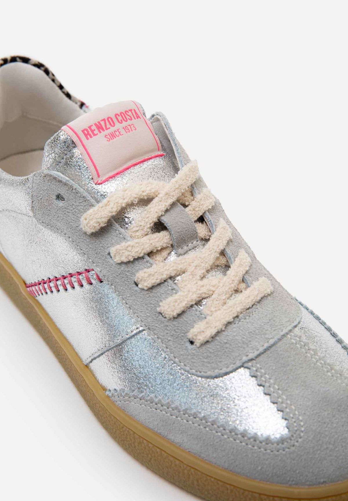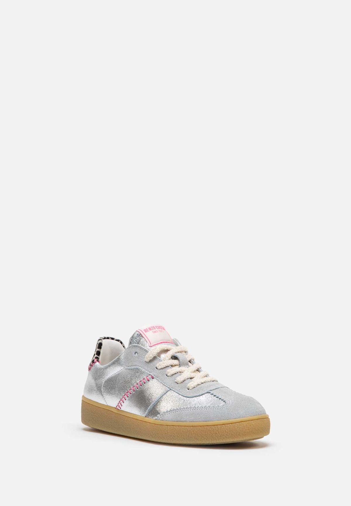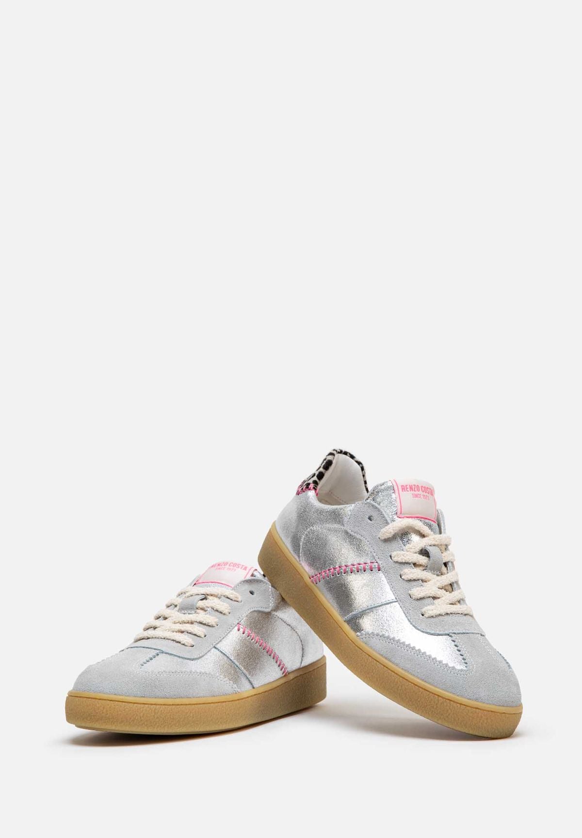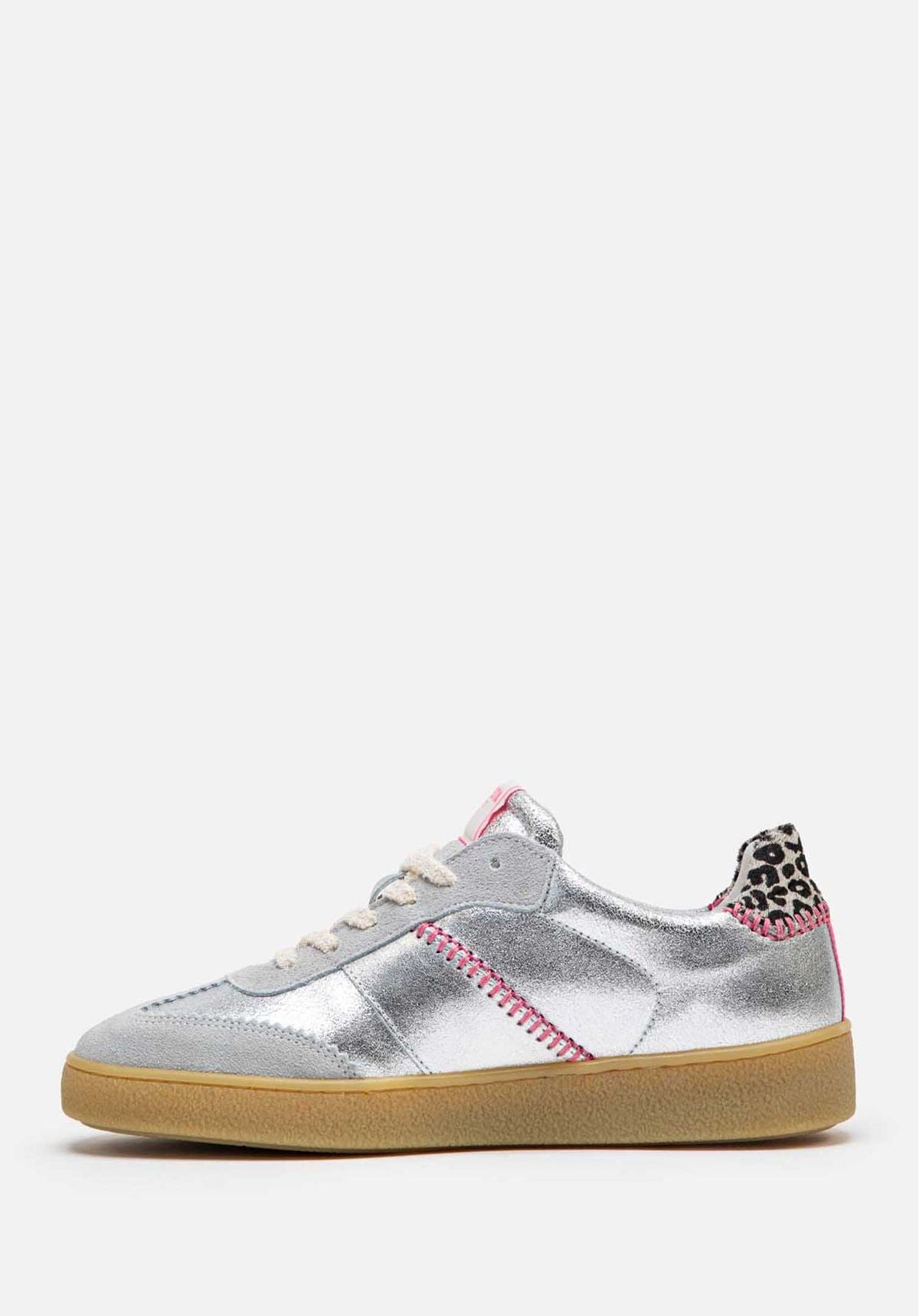 Sneaker de cuero para mujer en tono dorado claro, con combinación de acabado metalizado y gamuza beige que aporta textura y contraste. La costura lateral en hilo naranja añade un detalle vibrante, mientras que el talón con aplicación animal print tipo cebra y textura suave le da un toque inesperado y audaz. La suela de goma y los pasadores en textura bouclé refuerzan la comodidad sin perder estilo.Un diseño atrevido y versátil que eleva cualquier outfit urbano.